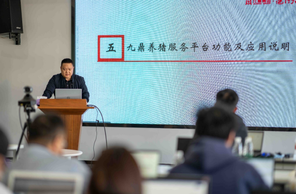 2023年集團的亮點之一是建立九鼎養豬服務平臺。研發中心江書忠博士為大家講解《九鼎養豬服務平臺之九鼎母豬生產成績改進及提升系統方案》。江博士介紹當前背景下,九鼎必須構建母豬生產成績改進及提升系統方案。江博士分享了九鼎試驗基地案例,母豬各環節飼養目標及常見問題的說明及影響母豬生產成績的因素。最后重點講解九鼎養豬服務平臺功能及應用說明,并在2023年研發中心重點工作中對九鼎母豬生產成績改進及提升系統方案規劃相關課程。