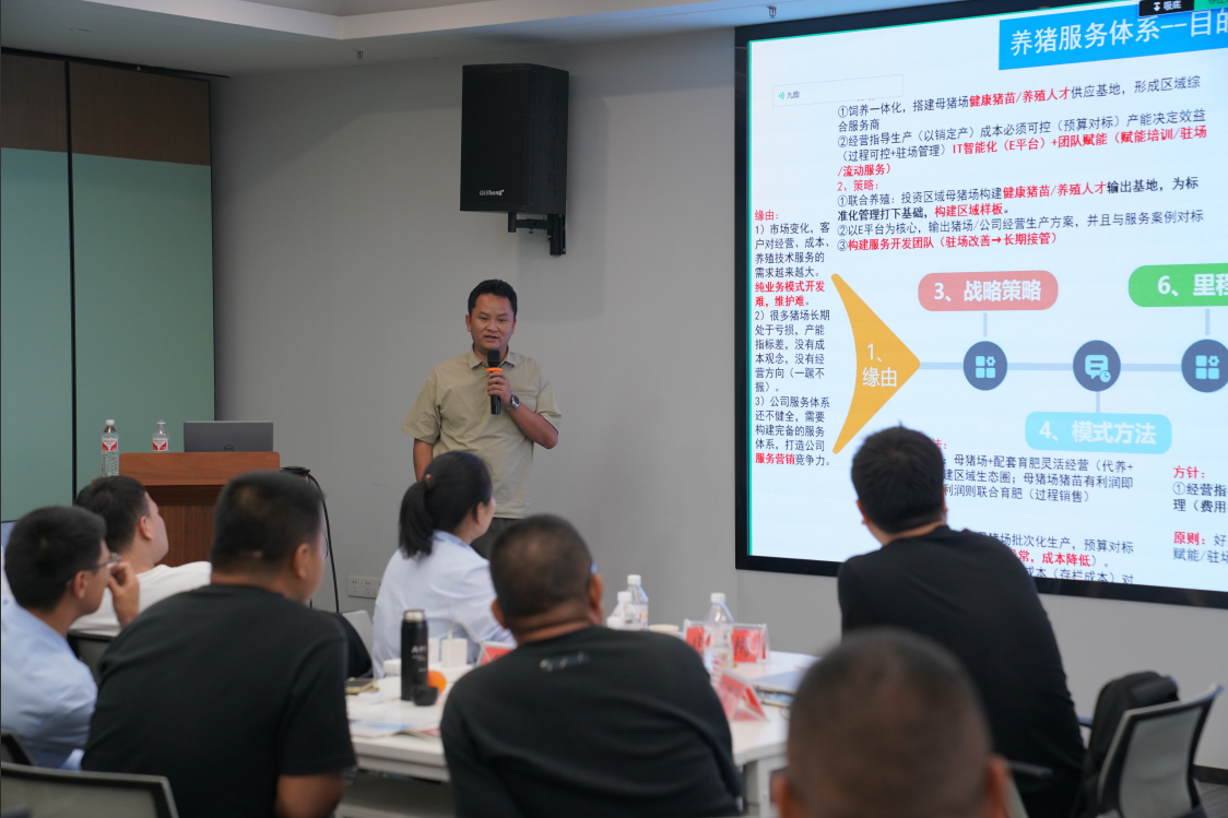 第二天李總裁從子公司生存的一個核心能力-養豬服務能力、4個重點(膘體管控+智能飼喂器、防流行性疾病、E平臺和育肥流程)進行講解,讓服務隊伍轉變觀念,認識行業的本質和格局,意識到服務的重要性,把三類業務作為基本點,從人、流程、結果出發,使養豬服務隊伍具備從0到1、1到N直至引爆流行的能力,打造九鼎服務競爭力。